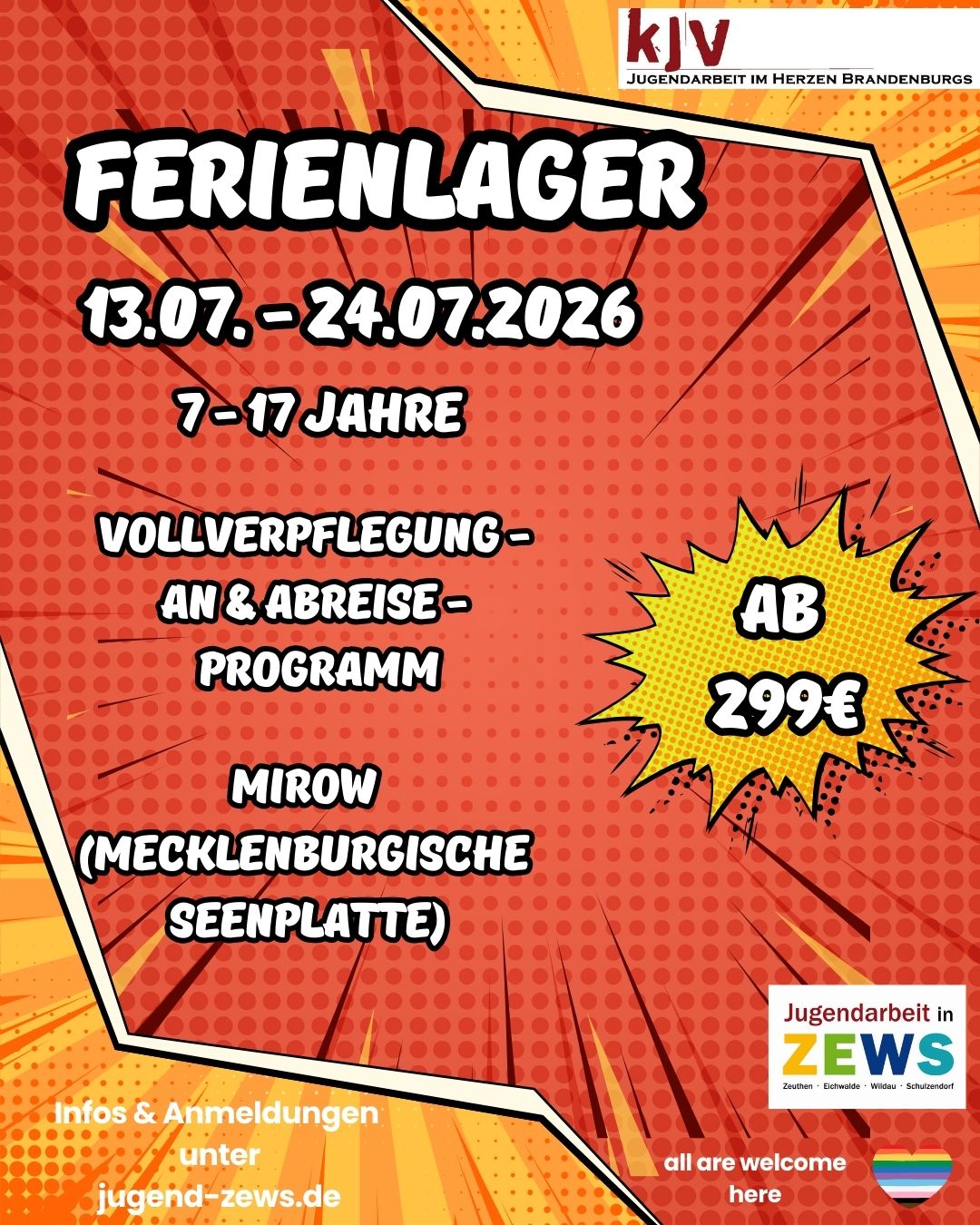 Unser diesjähriges Sommerferienlager wird vom 13.07. – 24.07.2026 stattfinden. Es wird wieder ein großes Camp für alle Altersgruppen von 7 bis 17 Jahren geben. Da uns das Objekt in Mirow an der Mecklenburgischen Seenplatte so gut gefallen hat, konnten wir es für das kommenden Jahr wieder gewinnen.